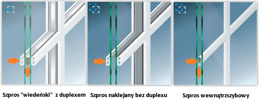 Szpros wiedeński: Jest połączeniem szprosu naklejanego oraz aluminiowej ramki wewnątrz szyby (tzw. duplex).